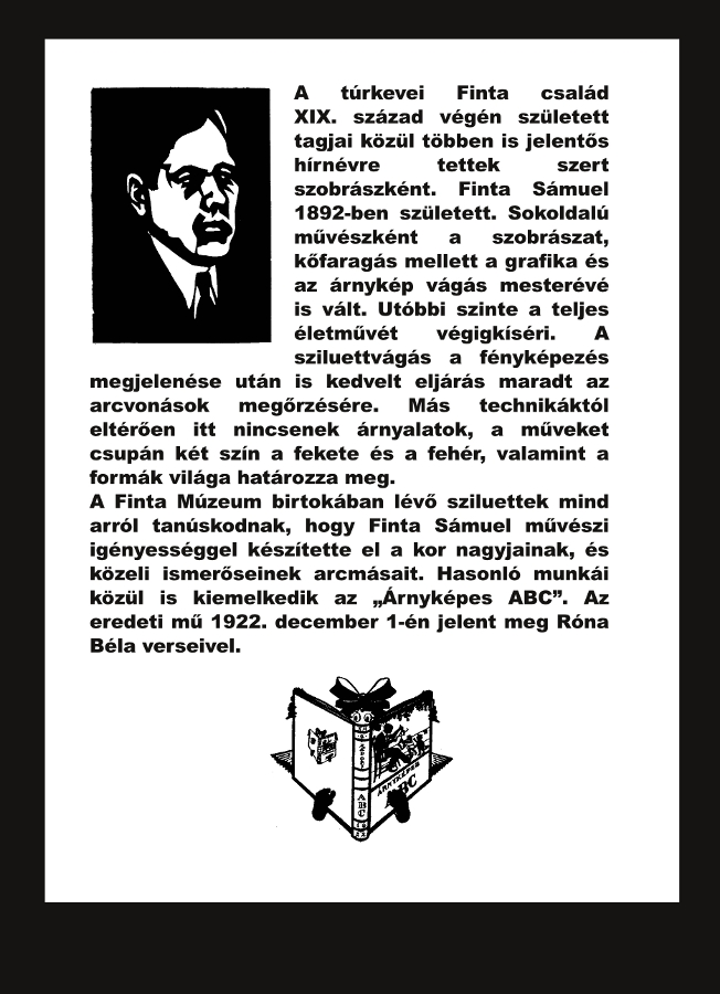 A jelentősebb kiránduló és fürdőhelyek sokáig jó megélhetést biztosítottak a sziluett vágóknak, akik néhány perc alatt készítették el a megrendelő árnyképét. Finta Sámuel feleségével számos ilyen helyen fordult meg, hogy anyagilag biztosíthassa megélhetését és további útjait. A múzeum birtokában lévő sziluettek mind arról tanúskodnak, hogy művészi igényességgel készítette el a kor nagyjainak, és közeli ismerőseinek arcmásait. Hasonló munkái közül is kiemelkedik az „Árnyképes ABC”, melyet jelen pillanatban is a kezében tart a Tisztelt Olvasó! Az eredeti mű 1922. december 1-én jelent meg Róna Béla verseivel, Palugyai Antal rendelésére a Rózsavölgyi és társa cég adta ki. Nyomtatására a Korvin testvérek nyomdájában került sor. Újbóli kiadása több mint kilencven év után jelent meg a Finta Múzeum gondozásában. „Árnyképes ABC” ezúttal nem csak az eredeti kiadvány utánnyomása, hanem kiegészül Finta Sámuel a Budapesti Állatkertben készített ollókivágásaival, és legérdekesebb sziluett portréival Párizstól Túrkevéig.